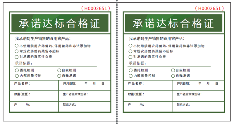 包裝銷售的食用農產品,應以銷售包裝為單元開具承諾達標合格證,以適當方式固定在包裝表麵。散裝銷售的農產品,應以實際交易批次為單元開具承諾達標合格證,實行一批一證,隨附農產品流通。